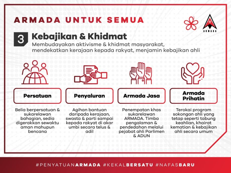 ARMADA adalah entiti yang menjalankan politik khidmat; dan semestinya khidmat kita bagi mencorakkan negara Malaysia yang lebih baik. Kita mahukan ARMADA yang lebih berkebajikan, adil dan saksama, yang mana masing-masing mampu untuk memegang amanah bagi berkhidmat untuk rakyat.