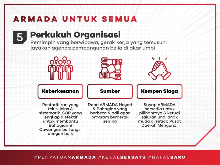 Saya akan terus berusaha untuk memperkemaskan organisasi dengan cara memastikan keberkesanan pentadbiran ARMADA di setiap Bahagian dan Negeri, agar semua terus berbakti dengan penuh efisien.